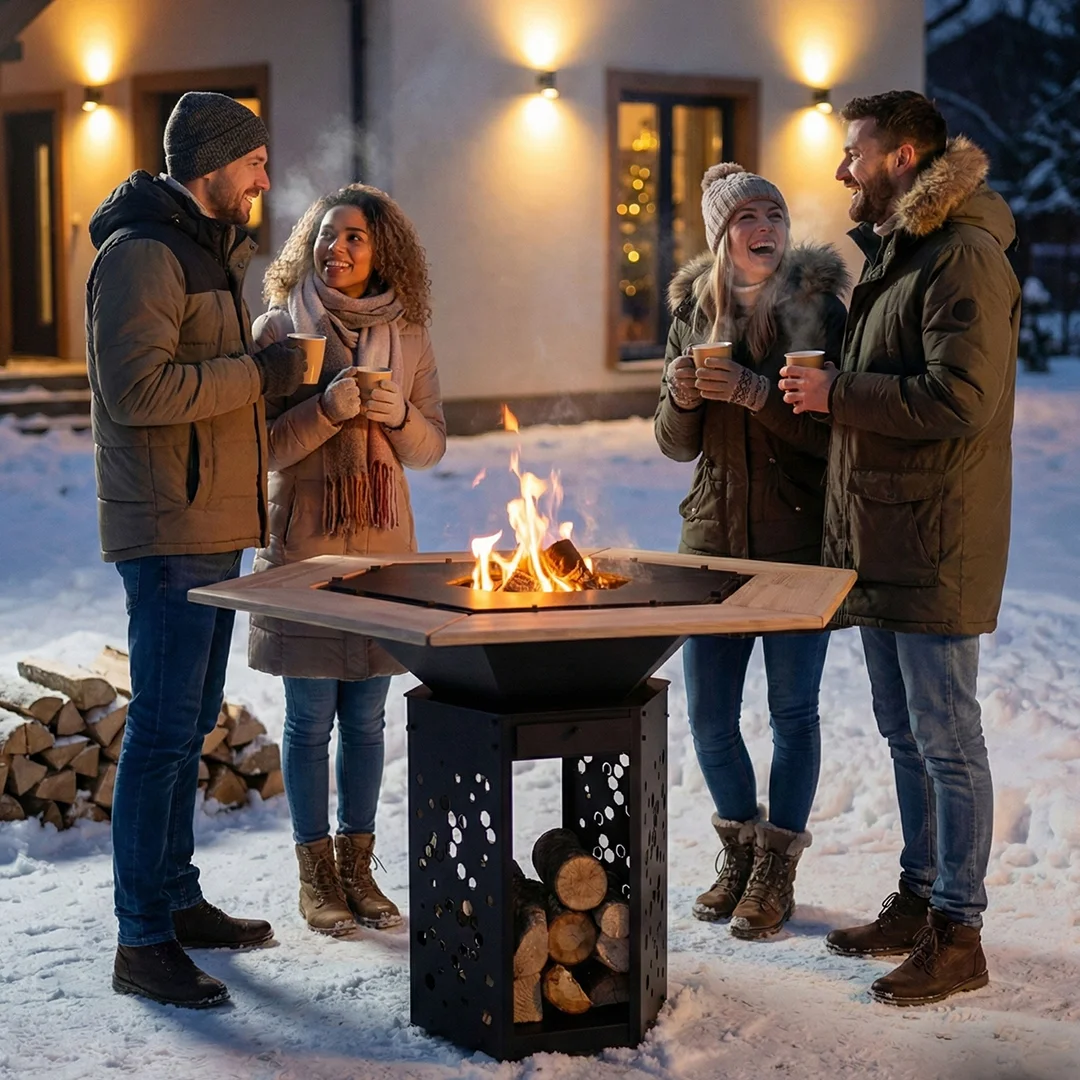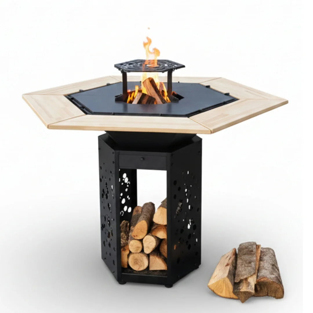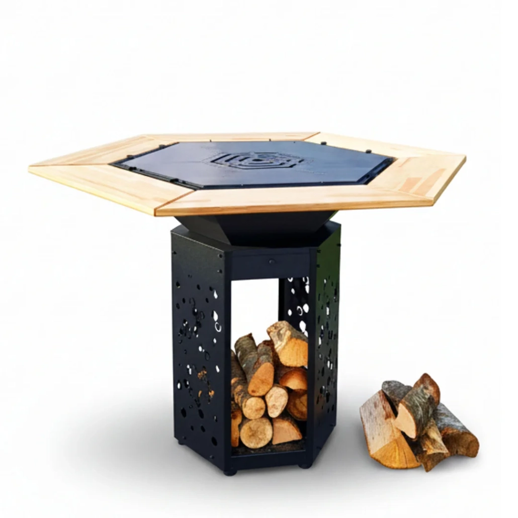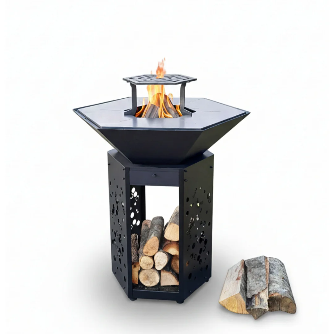 Φουτουριστικό Τζάκι: Η βαθιά πολυγωνική εστία μεταμορφώνει τη φωτιά σε ένα έργο τέχνης. Η βάση διαθέτει σχέδιο laser «κερήθρας», καθιστώντας την αποθήκη ξύλων μέρος του design.