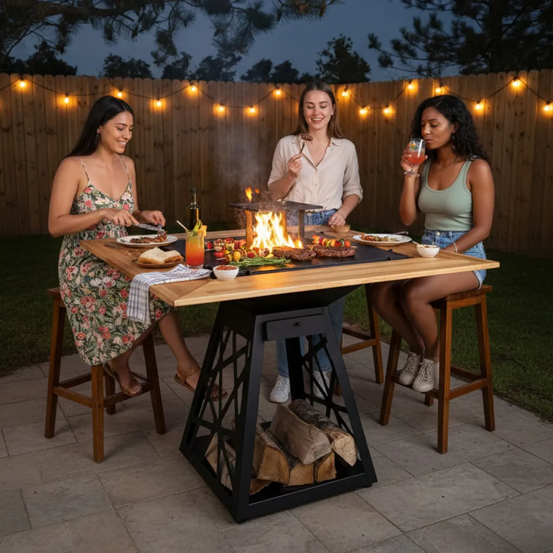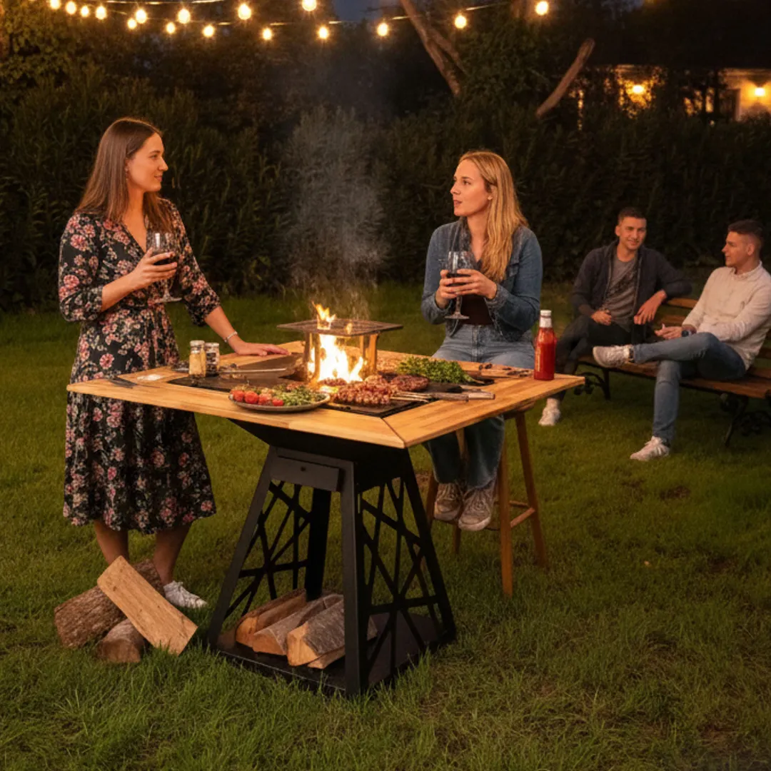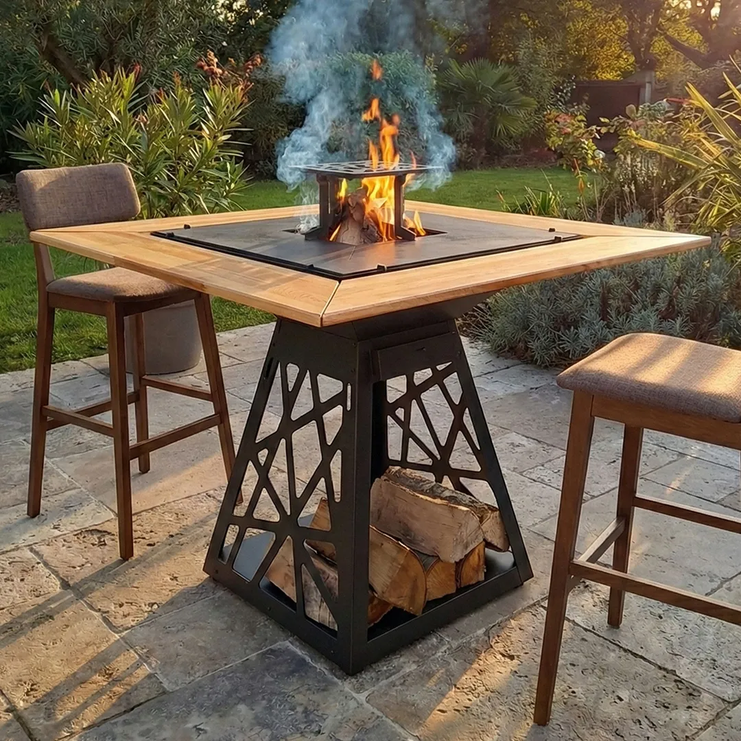 Εξωτερικό Τζάκι: Μια εστία φωτιάς που μοιάζει με έργο τέχνης, προσφέροντας μοναδική ατμόσφαιρα.