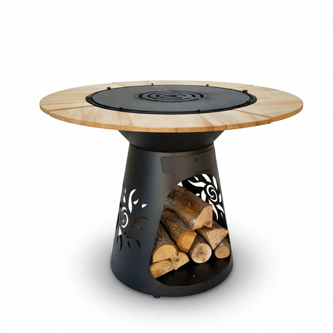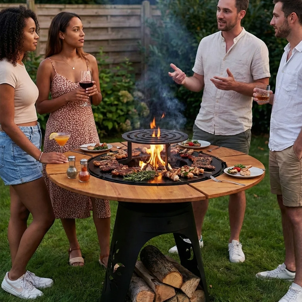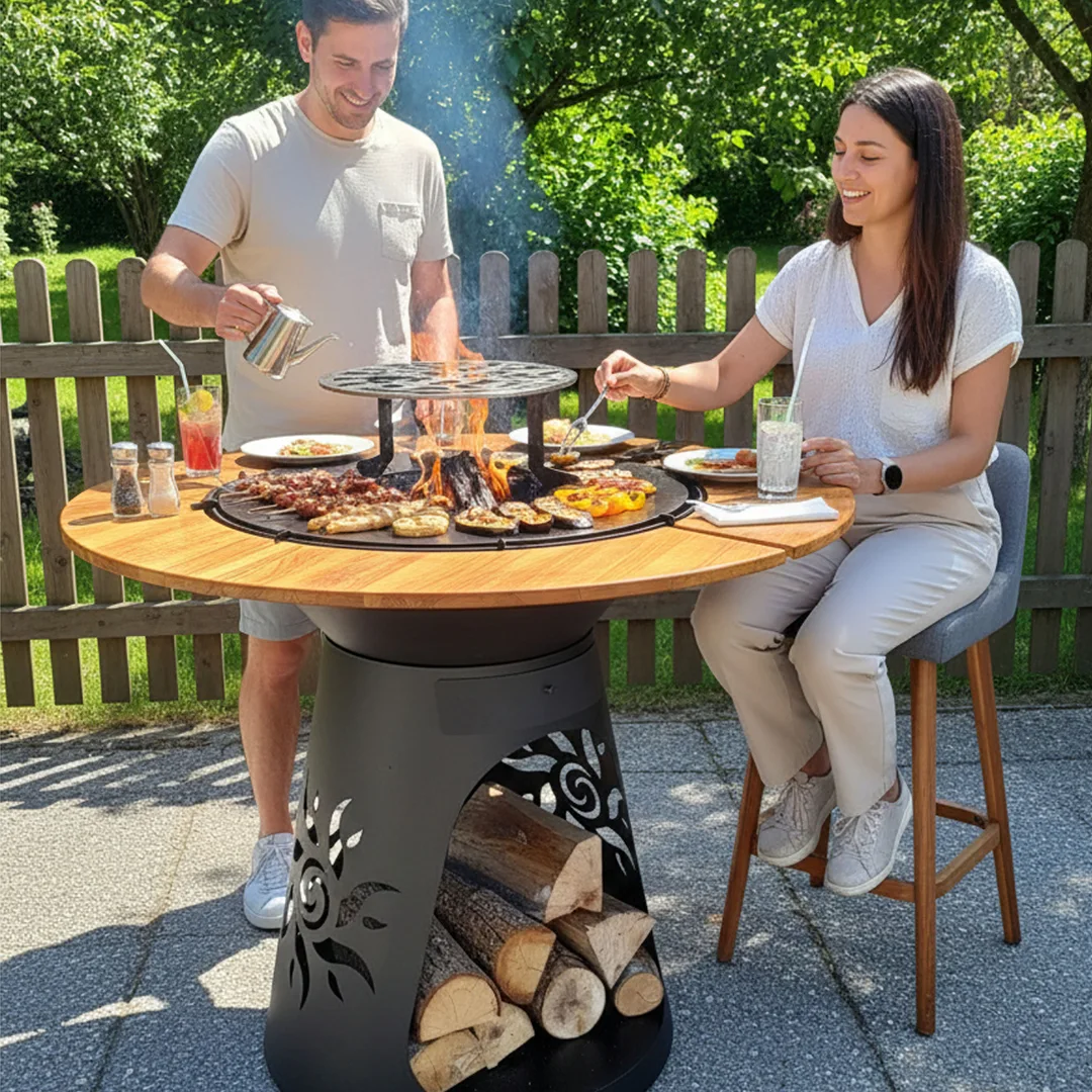 Concept “Social Grilling”: Με ύψος 90 cm και αφαιρούμενα ξύλινα ράφια (συνολική διάμετρος 117,5 cm), μετατρέπεται σε ένα τραπέζι-μπαρ. Οι καλεσμένοι σας κάθονται γύρω από τη φωτιά, απολαμβάνοντας το ποτό τους ενώ συμμετέχουν στη διαδικασία του ψησίματος.