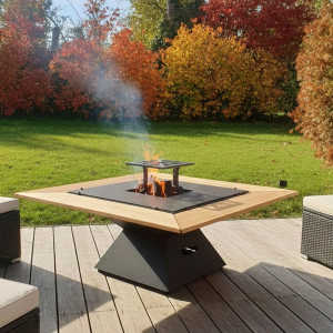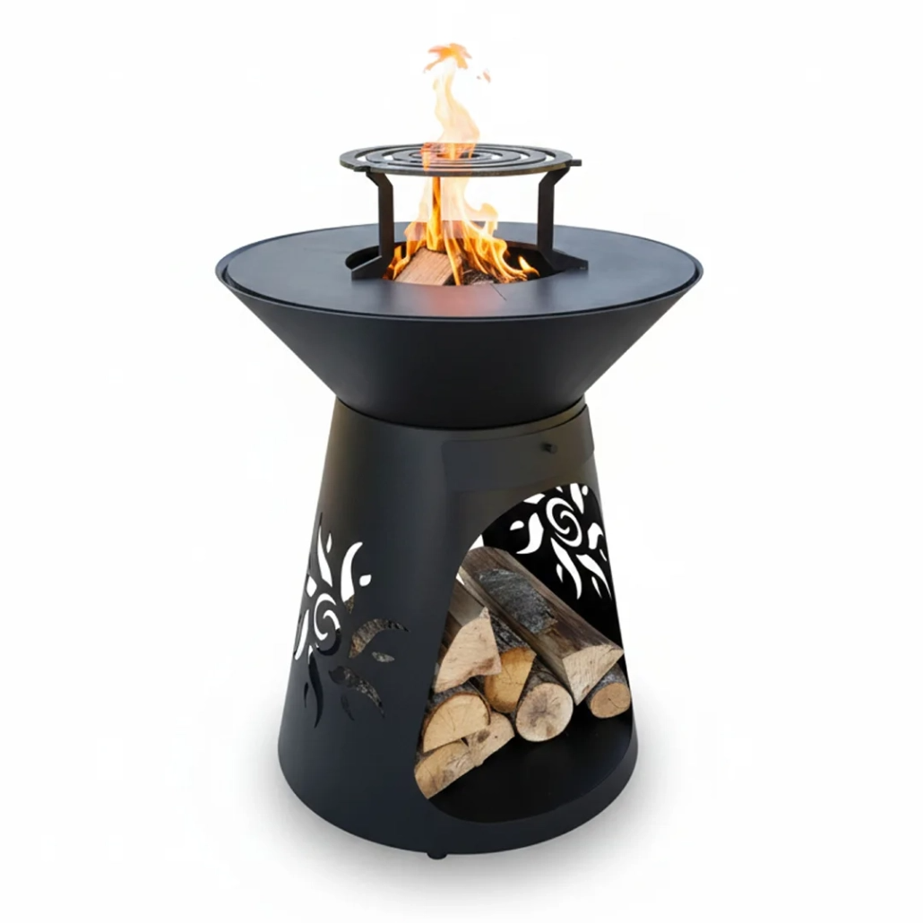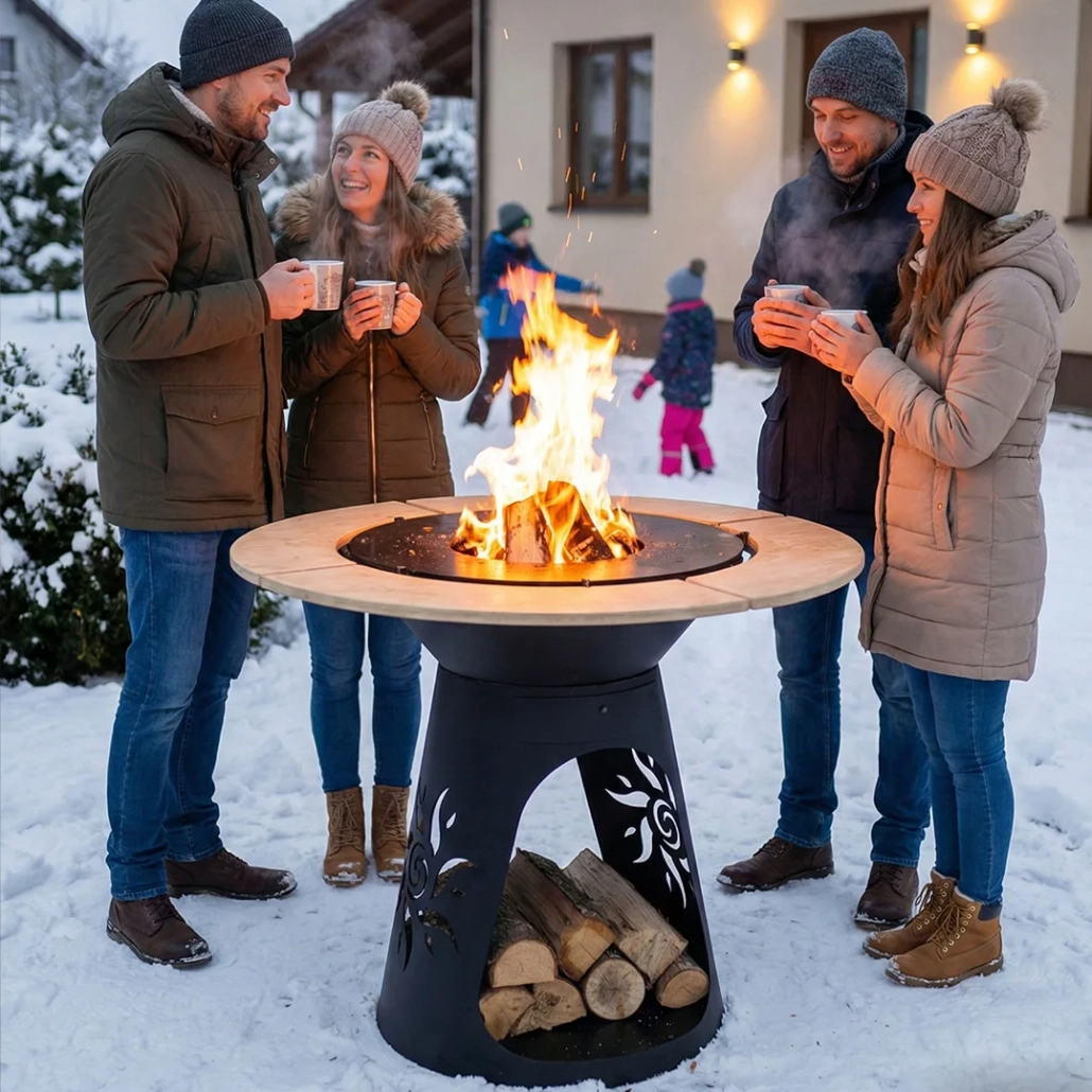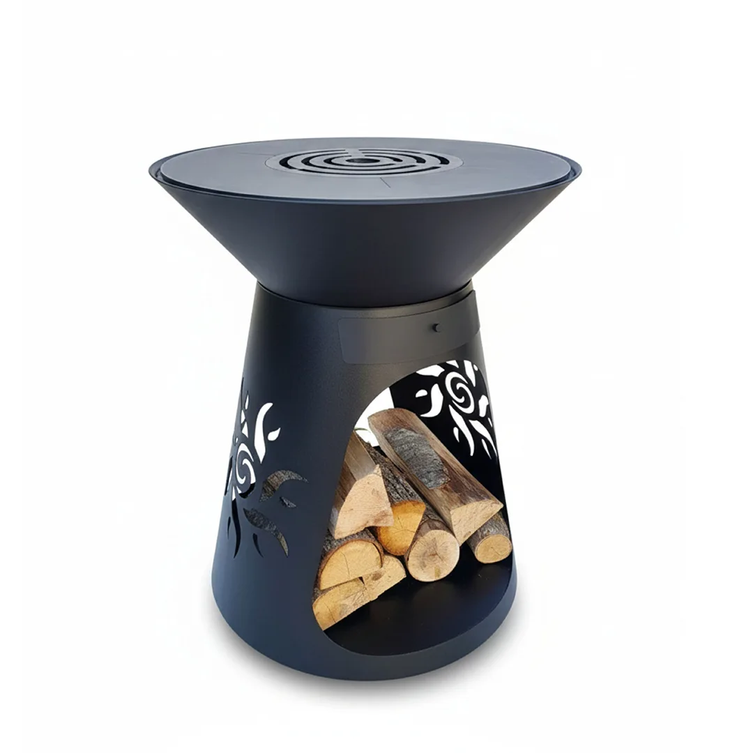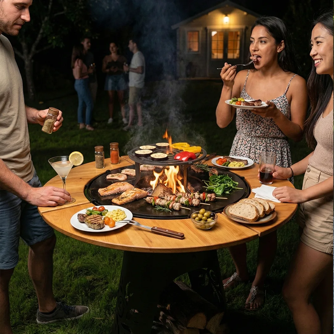 Concept “Social Grilling”: Με ύψος 90 cm και αφαιρούμενα ξύλινα ράφια (συνολική διάμετρος 117,5 cm), μετατρέπεται σε ένα τραπέζι-μπαρ. Οι καλεσμένοι σας κάθονται γύρω από τη φωτιά, απολαμβάνοντας το ποτό τους ενώ συμμετέχουν στη διαδικασία του ψησίματος.